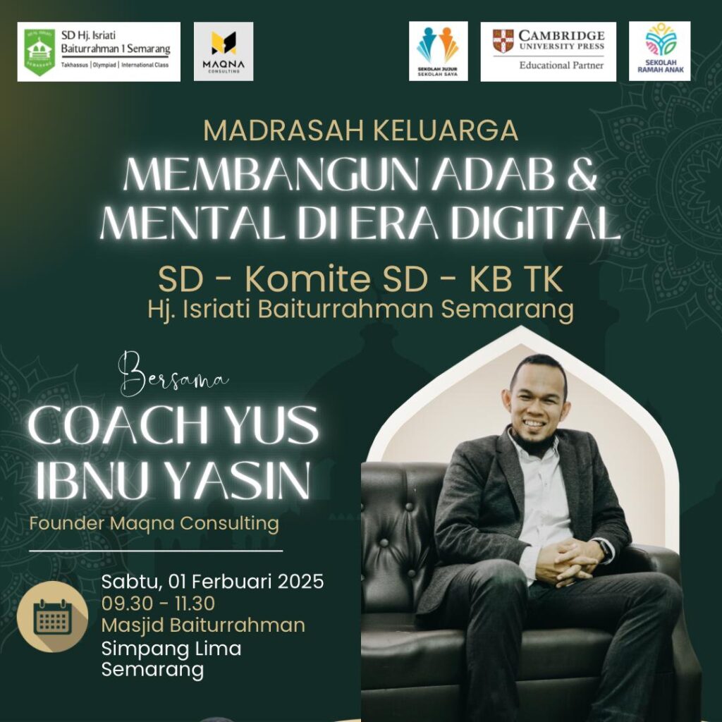 SD Hj. Isriati Baiturrahman 1 Semarang mengadakan kegiatan workshop bersama komite dan orang tua siswa KB-TK dan SD kelas 1-6 pada Sabtu, 1 Februari 2025. Kegiatan bertempat di Ruang Utama Masjid Raya Baiturrahman Jawa Tengah dimulai pukul 09.30 – 11.30 WIB. Adapun pembicara atau narasumber pada kegiatan ini adalah Coach Yus Ibnu Yasin, founder dari Maqna Consulting.