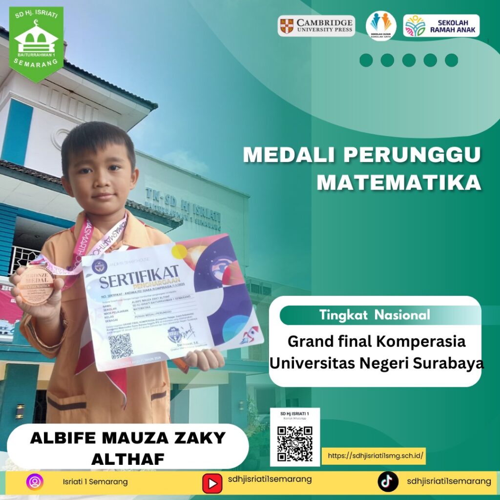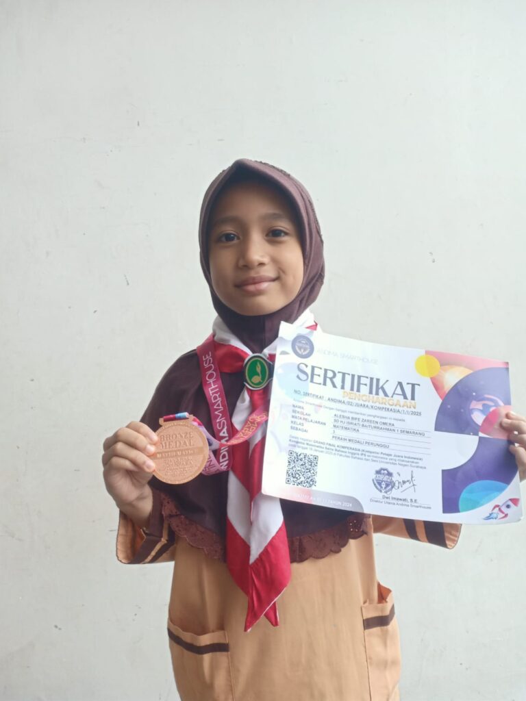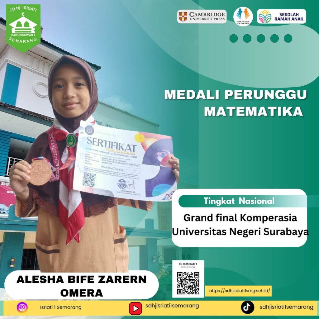 - Alesha Bife Zarern Omera 3C. Medali Perunggu Matematika Level Nasional Grand final Komperasia (Komletisi Pelajar Juara Indonesia) 18 Januari 2025 di Fakultas Bahasa & Senj Universitas Negeri Surabaya