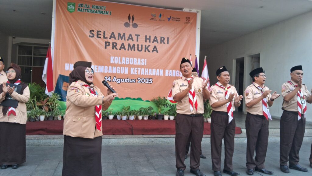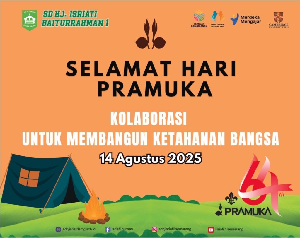 Dalam rangka memperingati Hari Ulang Tahun (HUT) Pramuka ke-64, SD Hj. Isriati Baiturrahman 1 Semarang menggelar upacara peringatan yang berlangsung dengan khidmat dan penuh semangat kepramukaan. Upacara dilaksanakan pada hari Kamis, 14 Agustus 2025, di halaman sekolah, dan diikuti oleh seluruh civitas sekolah, mulai dari siswa, guru, serta staff tenaga kependidikan.